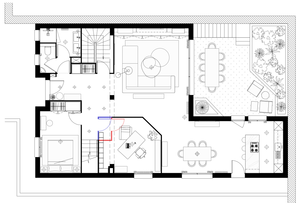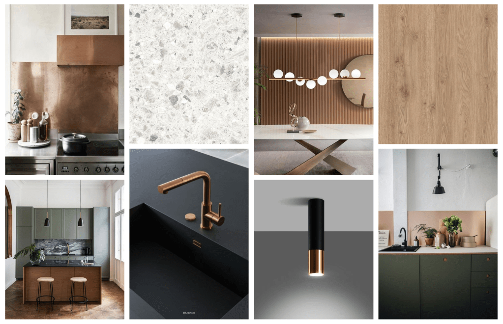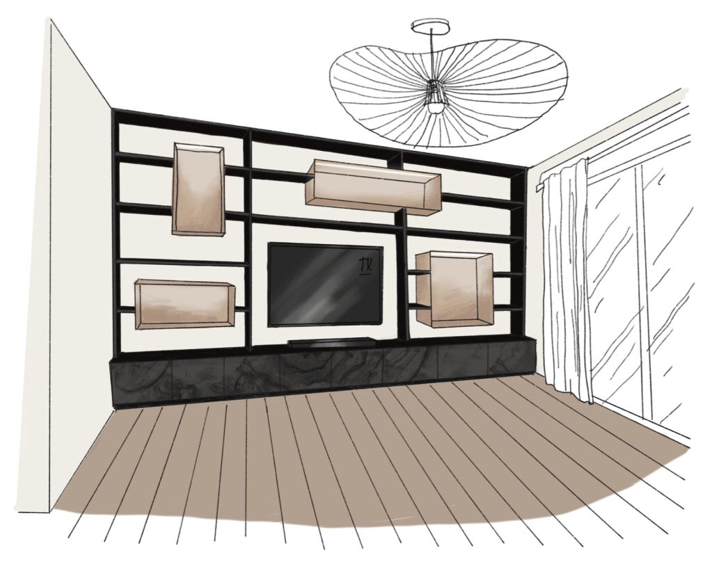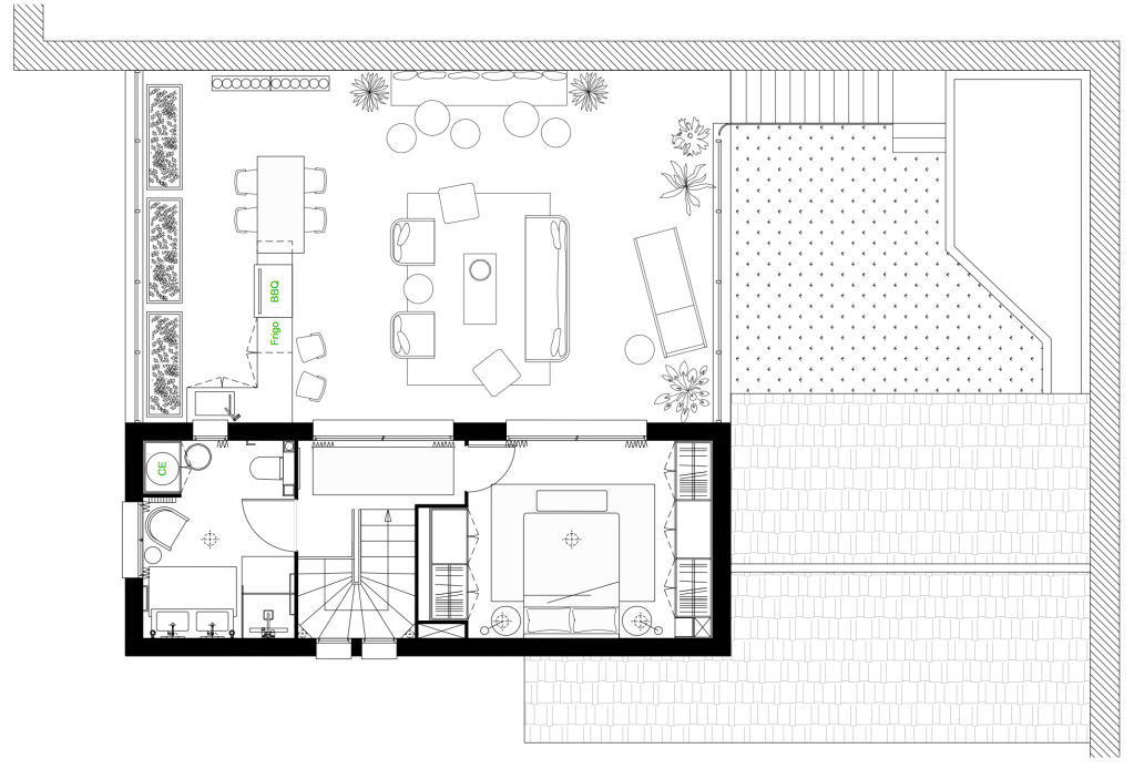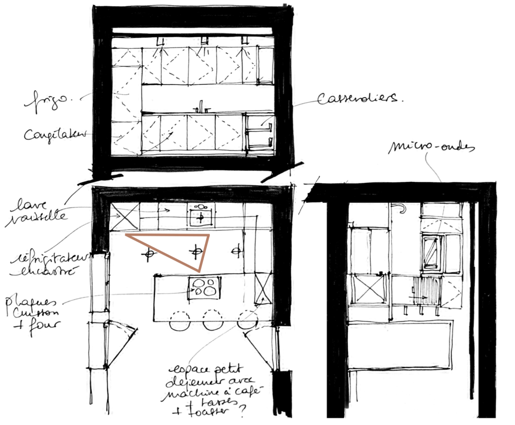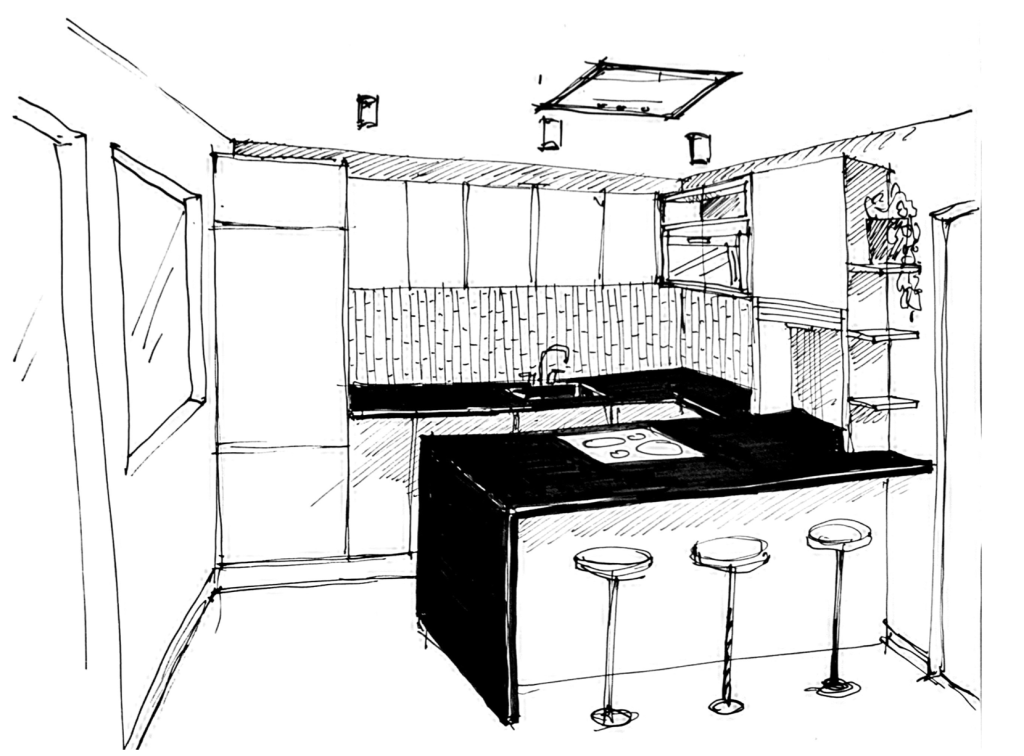 Cette chartreuse toulousaine de 130 m2 avec deux grandes terrasses dont une en rooftop, date des années 2000. Les clients sont attirés par le design minimaliste, avec des placards aux poignées cachées, des surfaces lisses. Cependant, bien amenée, ils étaient enclins à apporter de la couleur dans la cuisine qui est une pièce sombre, et dans les autres pièces plutôt par touches. La contrainte: le plan de travail en pierre noire, certaines pièces de mobilier à garder et un carreau aux motifs Caribéens à inclure dans la salle de bain.