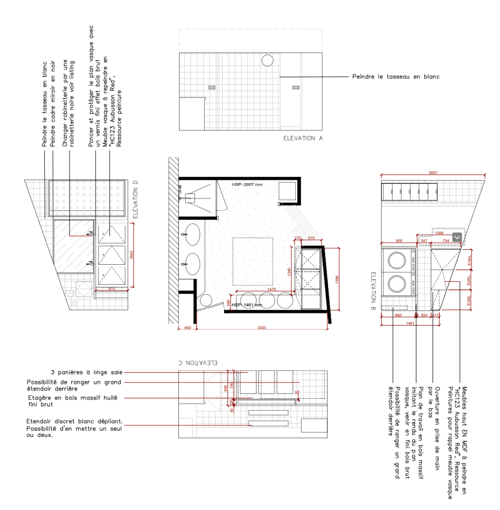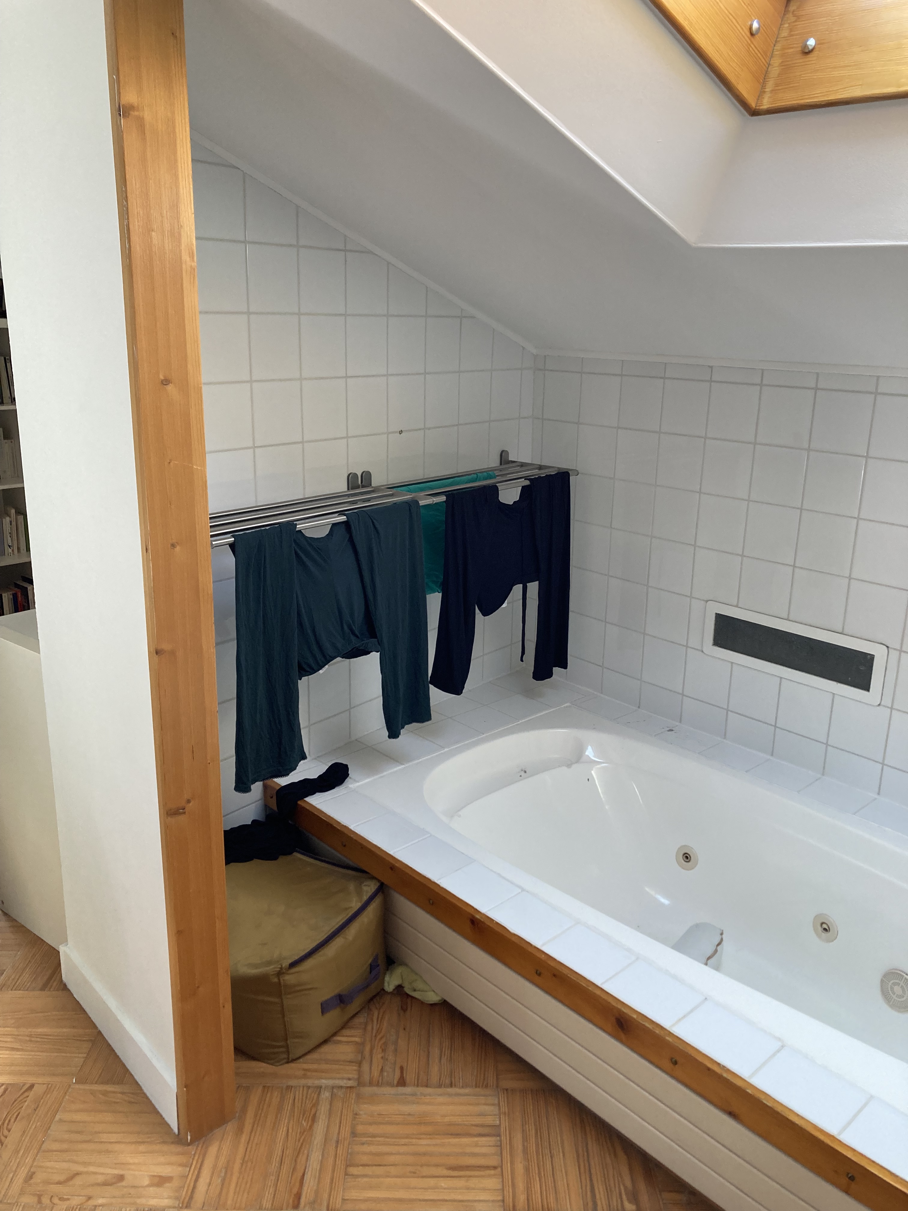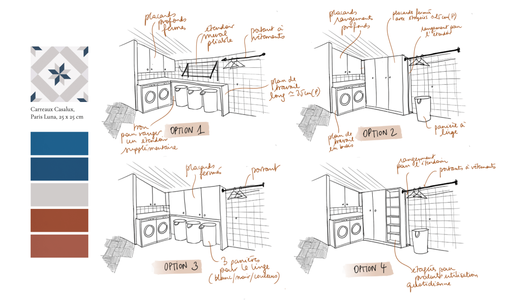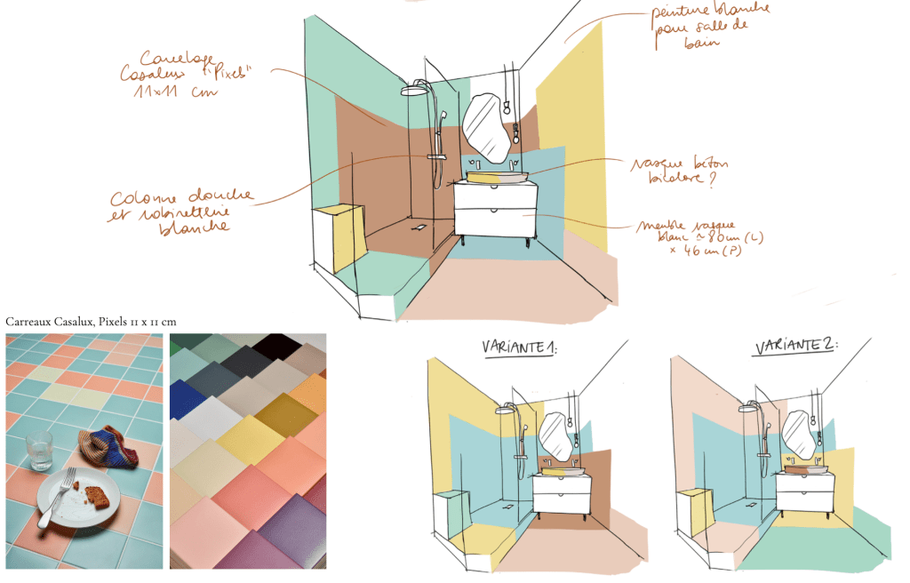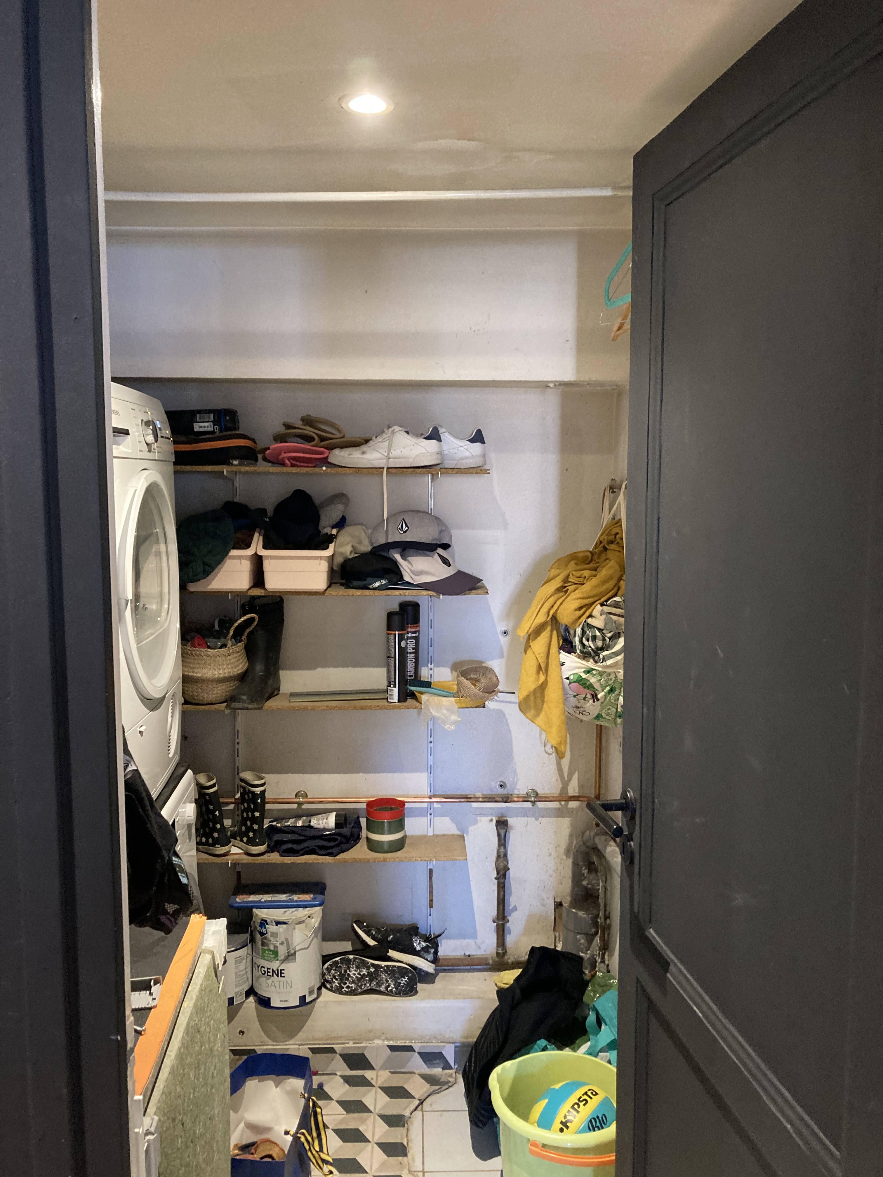 Pour ce petit projet dans un appartement en plein coeur de l’hyper centre toulousain, mes clients souhaitaient transformer une buanderie en salle de bain pour leurs enfants. Ils souhaitaient quelque chose de coloré, qui corresponde avec le reste de l’appartement, mais qui soit aussi pratique. Les contraintes : la taille de la pièce et la tuyauterie longeant les murs. Très petite, il fallait penser tout au millimètre près et anticiper les soucis potentiels lors des travaux. Ensuite, les clients souhaitaient transférer l’espace buanderie dans leur grande salle de bain attenante à la suite parentale. Il s’agissait là d’une rénovation partielle pour intégrer les machines, du rangement, séchage mais aussi moderniser la salle de bain par touches.