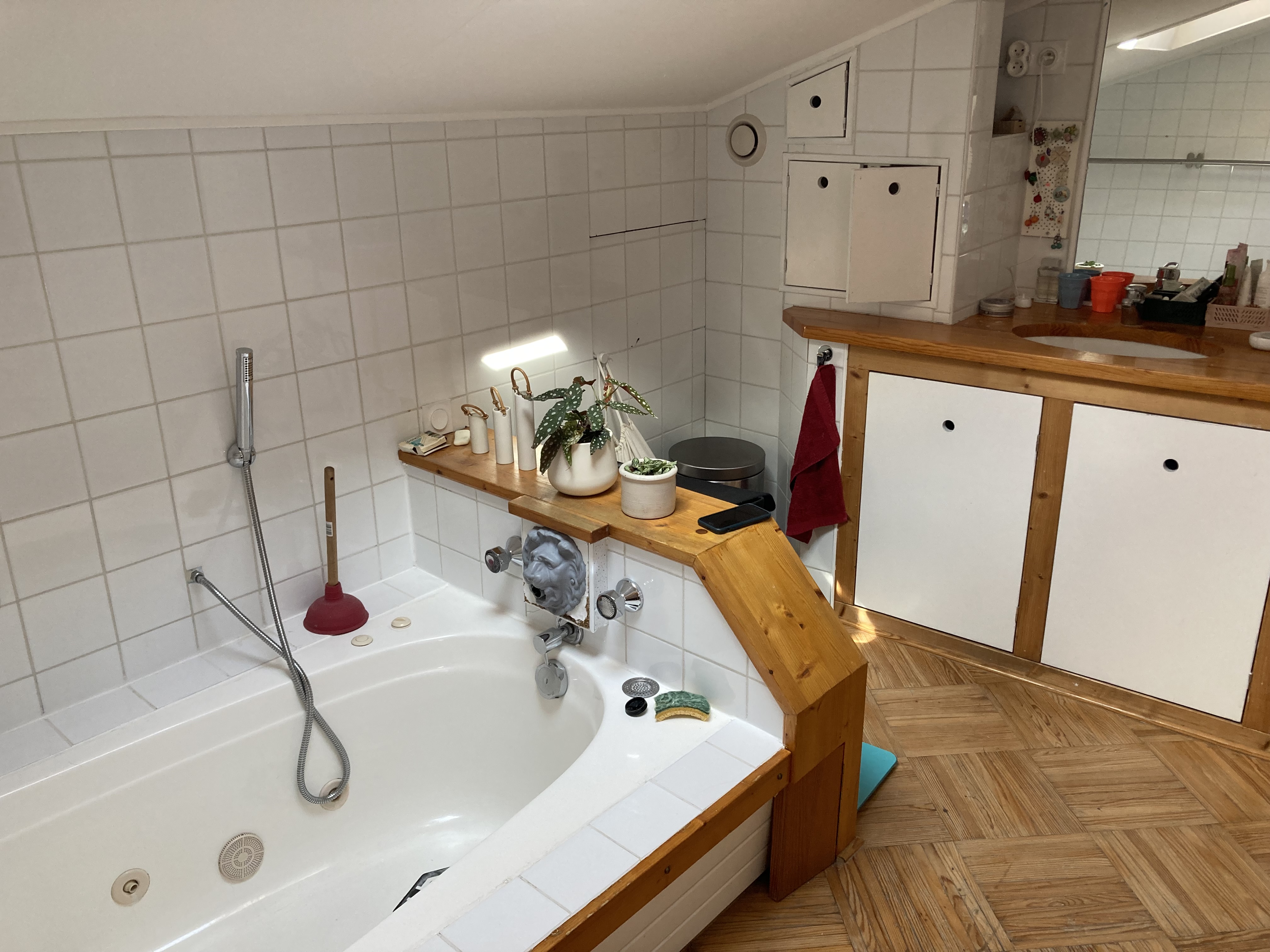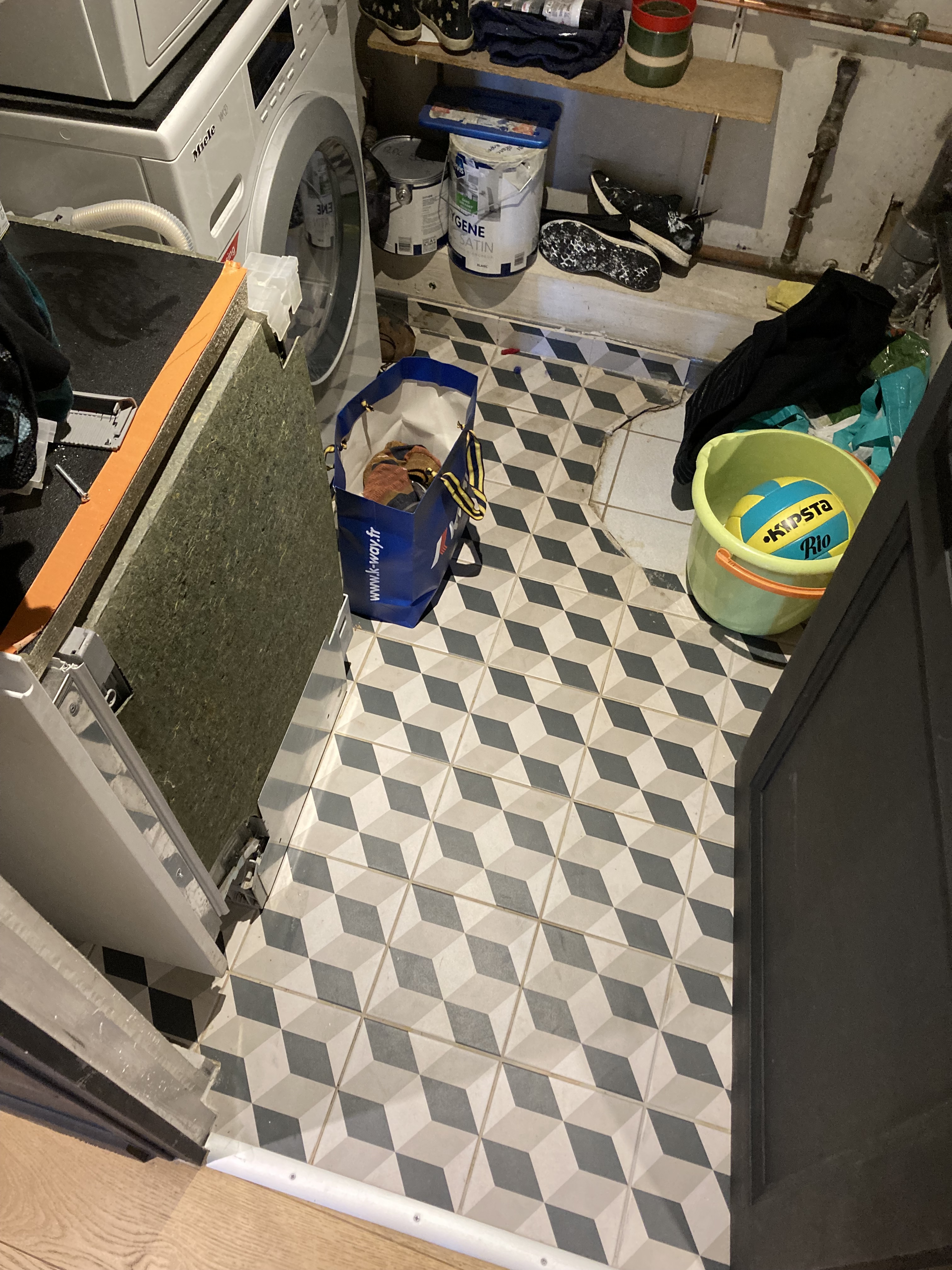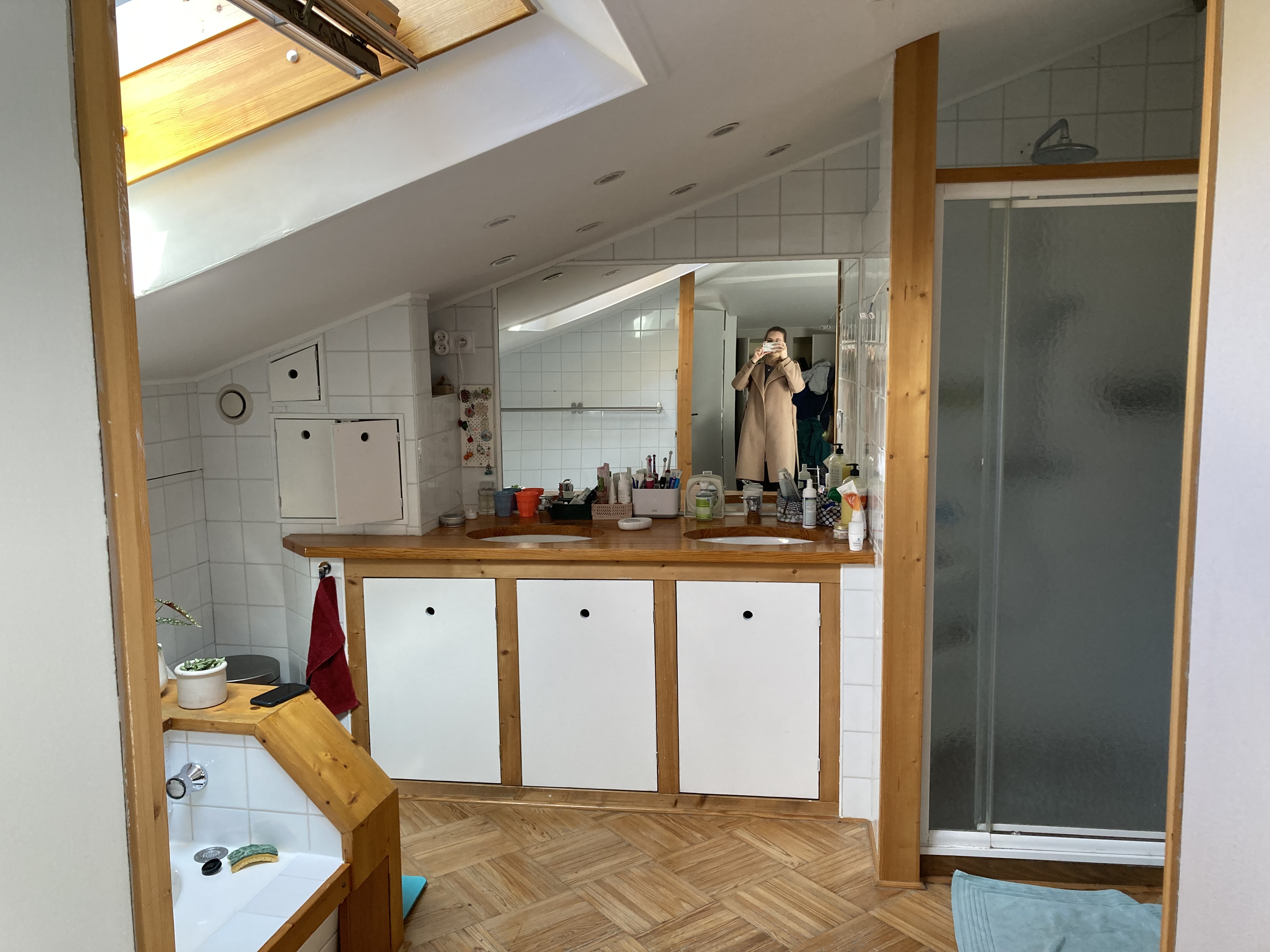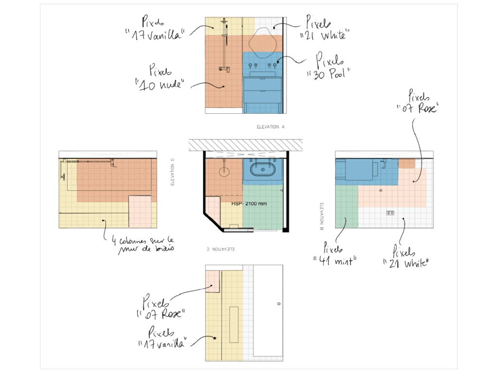 Pour ce petit projet dans un appartement en plein coeur de l’hyper centre toulousain, mes clients souhaitaient transformer une buanderie en salle de bain pour leurs enfants. Ils souhaitaient quelque chose de coloré, qui corresponde avec le reste de l’appartement, mais qui soit aussi pratique. Les contraintes : la taille de la pièce et la tuyauterie longeant les murs. Très petite, il fallait penser tout au millimètre près et anticiper les soucis potentiels lors des travaux. Ensuite, les clients souhaitaient transférer l’espace buanderie dans leur grande salle de bain attenante à la suite parentale. Il s’agissait là d’une rénovation partielle pour intégrer les machines, du rangement, séchage mais aussi moderniser la salle de bain par touches.