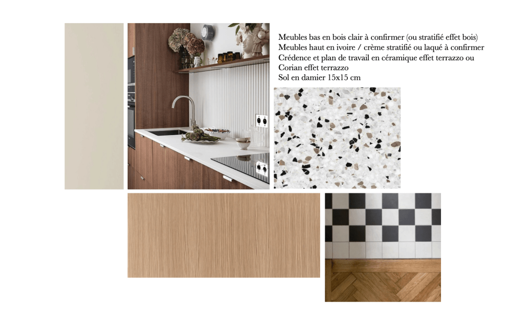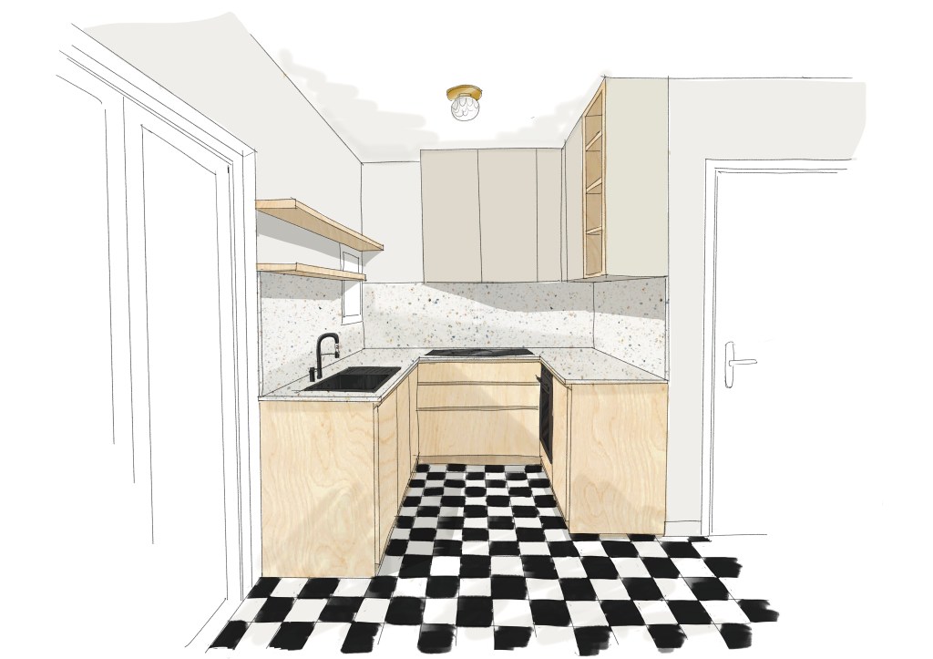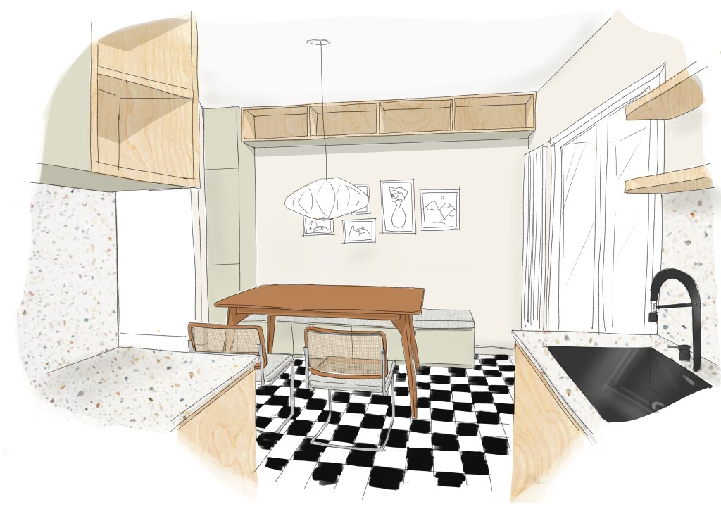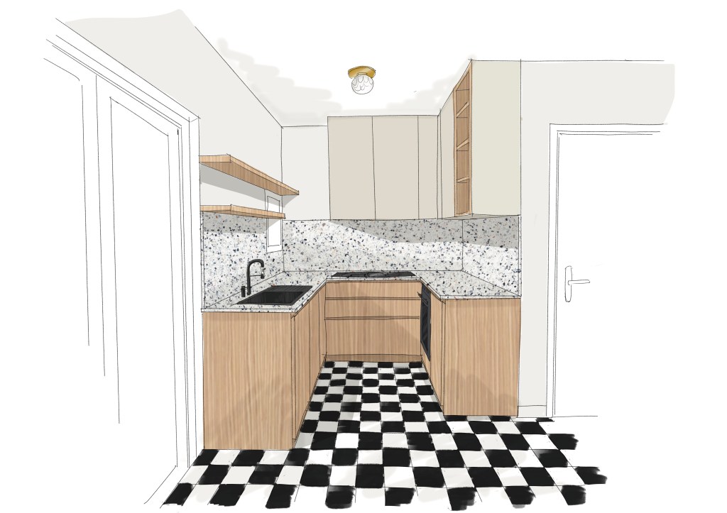 Des croquis colorés avec des effets de textures, matériaux ont été réalisés afin de faire des tests de finitions pour le bois et le plan de travail.